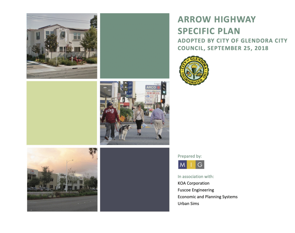 • Glendora’s East Arrow Highway Specific Plan (2018): Focuses on mixed-use revitalization, walkability, and improved connectivity along the corridor.